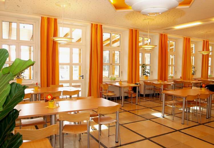Im Hauptgebäude liegen die Räumlichkeiten für die medizinische, psychosoziale und physiotherapeutische Therapie mit Inhalationsräumen, Bäder- und Massagekabinen. Dazu gehören auch Gruppenräume, ein Speisesaal, eine Lehrküche, ein Raum für die Hausaufgabenbetreuung, eine Bibliothek, eine Kreativwerkstatt und eine Sauna.