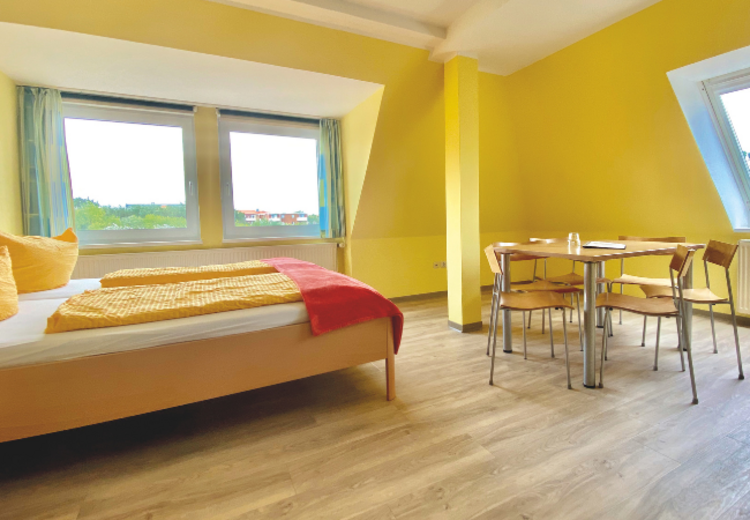 Die barrierefreie DRK Villa Kunterbunt verfügt im Hauptgebäude über 120 Betten, verteilt auf 44 moderne und freundlich ausgestattete Mutter/Vater- Kind-Appartements, davon drei behindertengerecht. Jedes Appartement hat eine Dusche, WC sowie Selbstwahltelefon mit Notruffunktion. Das Haus verfügt über mehrere Teeküchen. Waschraum mit Waschmaschine und Trockner befinden sich im Keller.