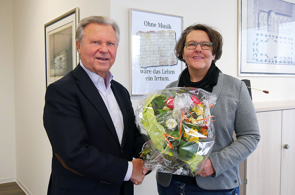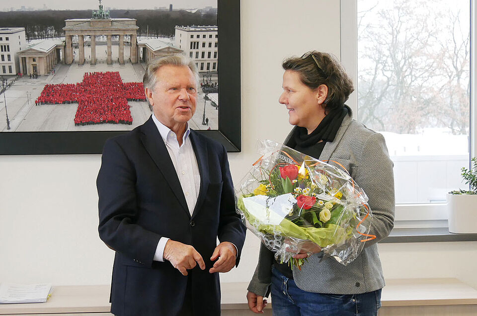 Zu Ehren ihrer 15 Jahre beim DRK Landesverband Oldenburg und ihres großartigen Einsatzes überreichte ihr Landesgeschäftsführer Dieter Holzapfel einen Blumenstrauß, und lobte ihr außerordentliches Engagement für die Freiwilligendienste.