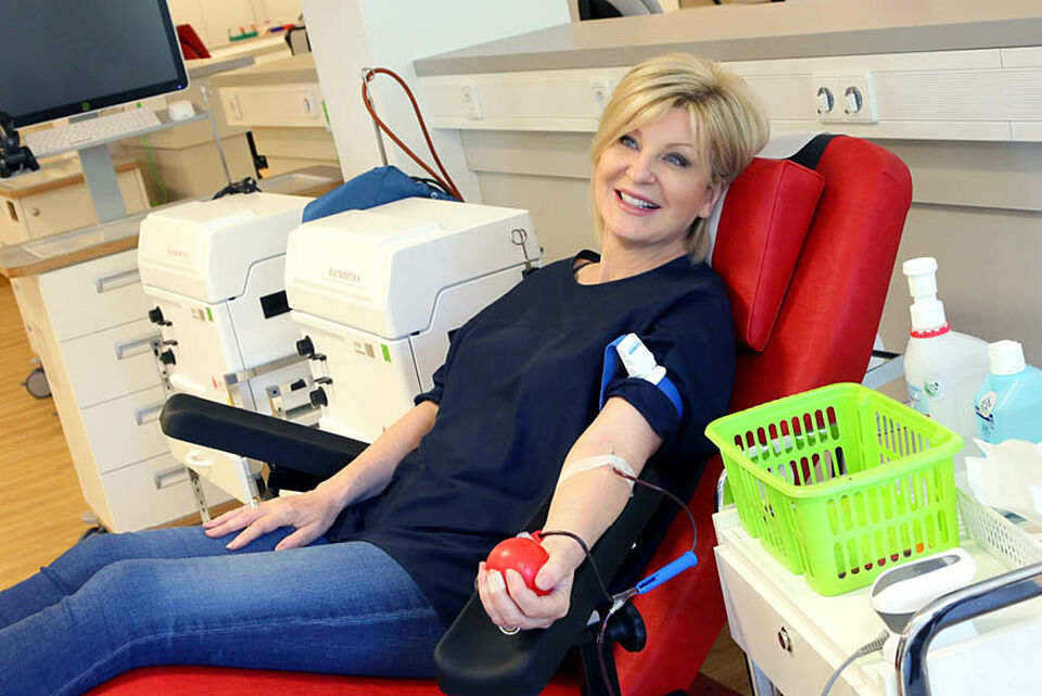 Bei einer feierlichen Veranstaltung am Abend des 14. Juni überreichen DRK-Präsidentin Gerda Hasselfeldt und DRK-Botschafterin Carmen Nebel den Blutspendern Ehrennadeln und Urkunden.
