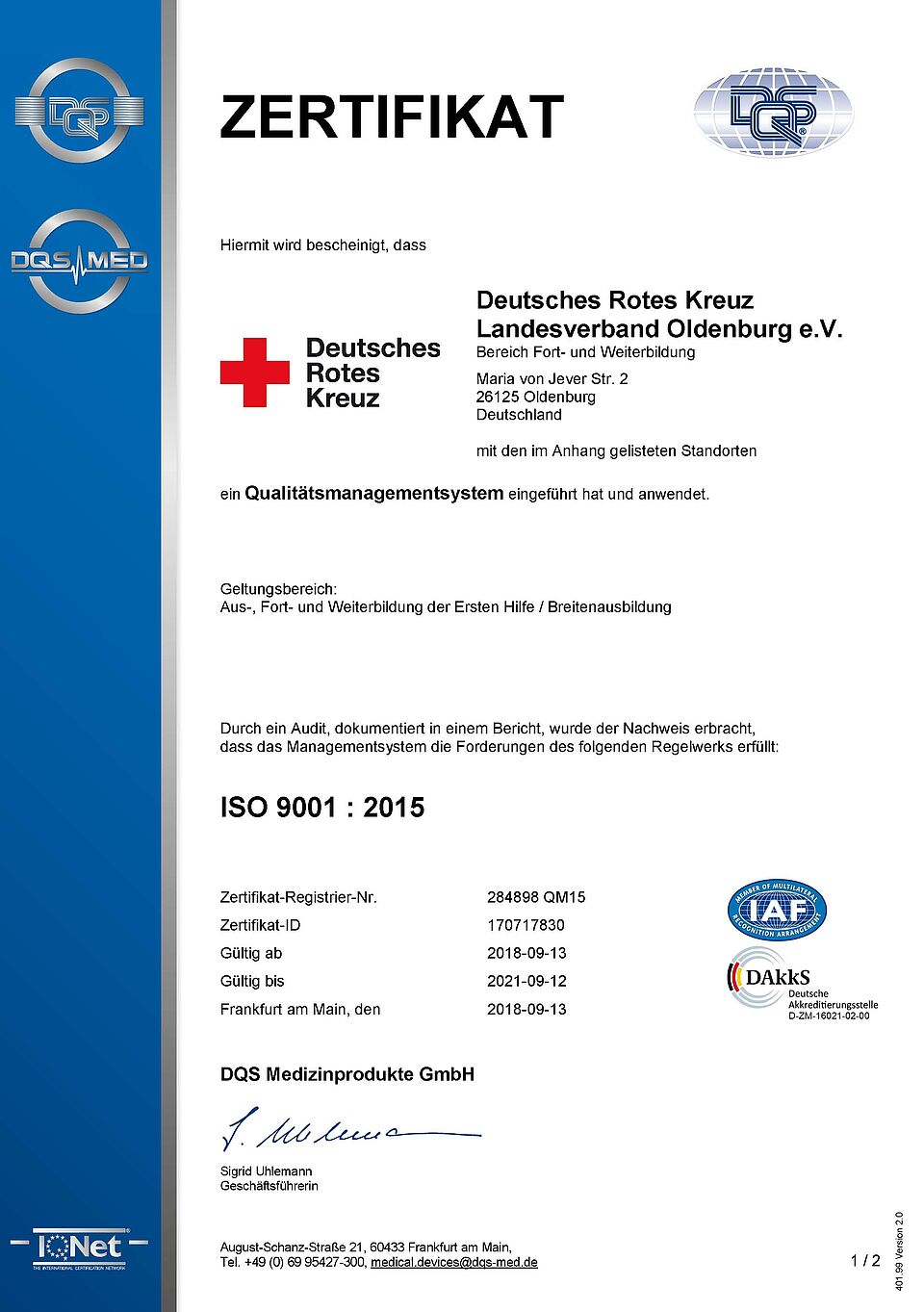 Im September wurde unser Qualitätsmanagement im Bereich Aus-, Fort- und Weiterbildung der Ersten Hilfe / Breitenausbildung nach der aktuellsten Norm ISO 9001:2015 neu zertifiziert. "Ein großer Erfolg", konstatiert der QM-Beauftragte Christopher Fiss, "mit der Zertifizierung nach der aktuellsten Norm, zeigen wir, dass unsere Erste Hilfe und Breitenausbildung qualitativ stets auf höchstem Niveau agiert."