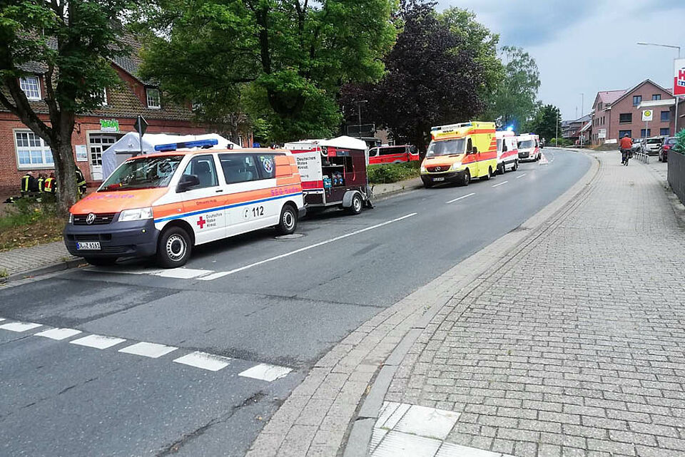 Auch eine kleine, medizinische Behandlung mussten die Sanitäterinnen und Sanitäter zwischenzeitig vornehmen. Besonders erfreulich war die gute Zusammenarbeit mit dem lokalen Einzelhandel, der die DRK Einsatzkräfte unterstütze. So sorgten unter anderem die Bäckerei Tönjes, der Getränkemarkt Hol ab und weiter Läden für den nötigen Nachschub an Lebensmitteln und Getränken. Auch die Gemeinde Ganderkesee selbst half mit und stellte kurzer Hand die Räumlichkeiten des Jugendzentrums zur Verfügung. Bis in die Abendstunden blieb das Helferteam des DRK vor Ort und versorgte alle beteiligten Einsatzkräfte.