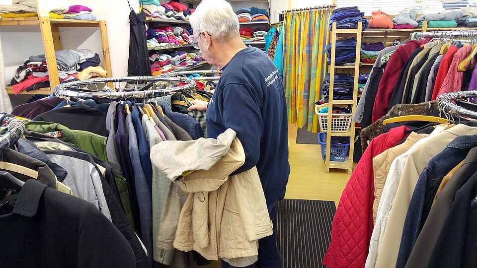 Erstmal angefangen, fand sie schnell Gefallen an der ehrenamtlichen Arbeit, wodurch es nicht bei der Kleiderkammer blieb. Ersthelferin, Sanitäterin, Schwesternhelferin, Flüchtlingshelferin, in der Betreuungs- und Verpflegungsgruppe oder der Blutspende. Es gibt eigentlich nichts im vielfältigen Aufgabenbereich des DRK, was die Rotkreuzlerin nicht gemacht hat. Fragt man sie nach ihrem kuriosesten Erlebnis, dann fällt ihr schnell der Tag ein, an dem sie und die Kollegin einem Besucher der Einrichtung die Haare geschnitten haben. Auch bei solchen Anliegen haben die Damen immer gerne geholfen. „Weißt Du noch damals die Übung, als wir im Wald bei Wardenburg herumgeirrt sind“, erinnern sie und Helferkollege Bodo Struthoff sich gerne zurück. „Oder der Sanitätsdienst beim Staatstheater in Oldenburg, als ich den Weg nicht gefunden habe“, sagt sie etwas verlegen, nimmt einen Schluck aus ihrer Kaffeetasse und steht auf. Besucher sind in die Kleiderkammer gekommen, zwei von insgesamt 37 an diesem Tag und die nimmt Schneidereit sofort in Empfang.