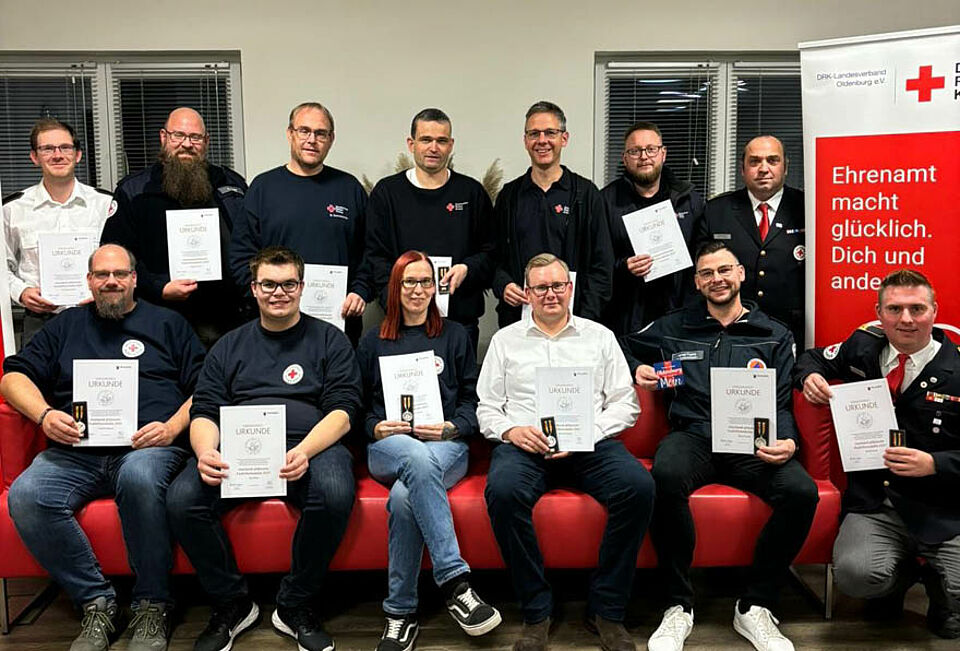 Bei der Katastrophenschutztagung am 8. November durfte der DRK-Landesverband Oldenburg e.V. 16 Mitglieder der Medizinischen Task Force 06 für ihren Hochwassereinsatz im Ahrtal ehren.