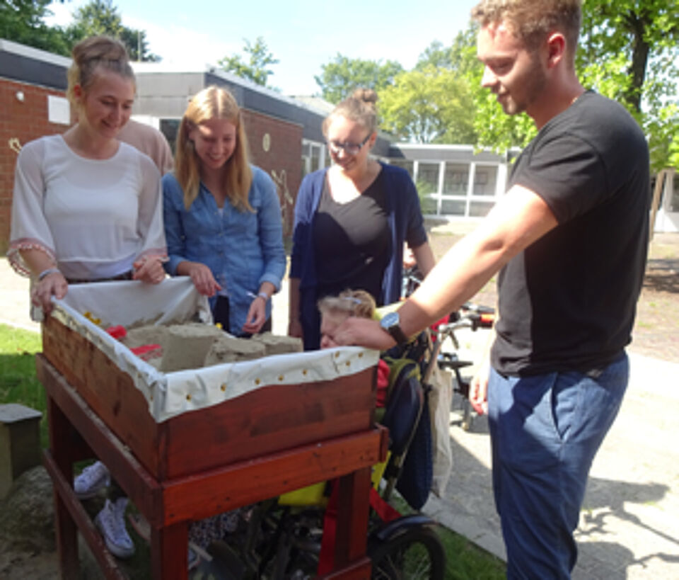 Den acht Freiwilligen, die neben diesem Projekt auch die Klassen in anderen Bereichen ein Jahr lang unterstützt und mitbetreut haben, fiel Anfang des Jahres auf, dass es für Rollstuhlkinder sehr schwer ist, ohne großen Aufwand im Sand zu spielen. Deshalb entwickelten sie ein Konzept, fertigten Zeichnungen und Entwürfe an und so entstanden schließlich die zwei Sandkästen in unterschiedlichen Größen. Für die Schülerinnen und Schüler, die im Rollstuhl sitzen, ein echter Gewinn. Das finden auch Christina Klotz und Anne Fischer, die Leiterinnen der Tagesbildungsstätte für geistig beeinträchtigte Kinder und Jugendliche: „Die FSJ´ler tragen dazu bei, dass es unseren Schülern gut geht“!