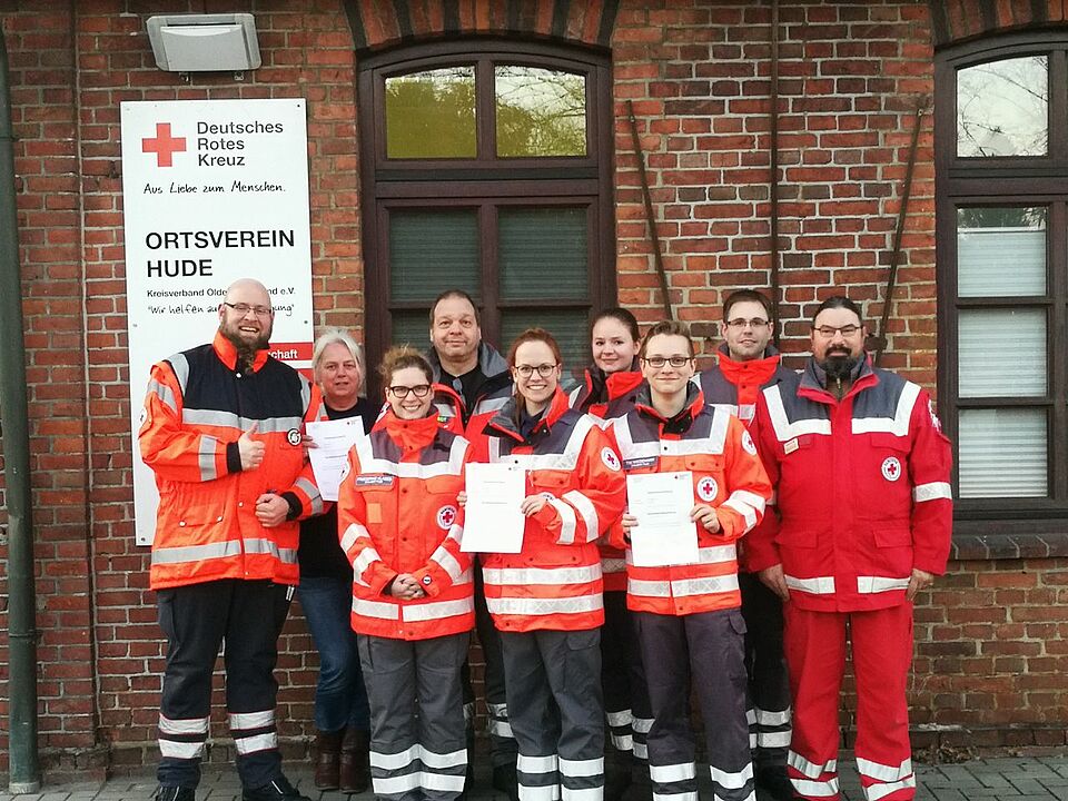 Angeboten wurde dieser Lehrgang vom neuen DRK Zentrum für Integra-tion & Bildung in Hude, wo das Rote Kreuz künftig diverse Aus- und Fortbil-dungen im medizinischen und sozialen Bereich anbietet, beispielsweise für Mitarbeiter im Rettungsdienst, der Pflege oder in Arztpraxen sowie betriebliche Ersthelfer in Unternehmen. Unterstützung bei dieser Ausbildung gab es von den Ehrenamtlichen des DRK Ortsvereins Hude, die für das leibliche Wohl gesorgt haben und als Statisten die Prüfungen begleiteten.