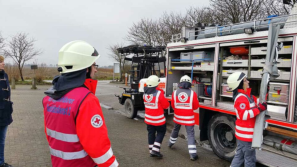 Für die praktische Ausbildung am Samstag wurde der Lehrgang materiell durch einen Gerätewagen Betreuung aus dem Kreisverband Ammerland unterstützt. Für die Einrichtung eines Rettungsmittelhalteplatzes machten sich mehrere Fahrzeuge und Helferinnen und Helfer aus den Kreisverbänden Oldenburg-Land und Oldenburg-Stadt auf den Weg nach Schillig. Am Sonntag unterstützte die Bereitschaft Schortes mit Material vom Rüstwagen der Technik und Sicherheit.
