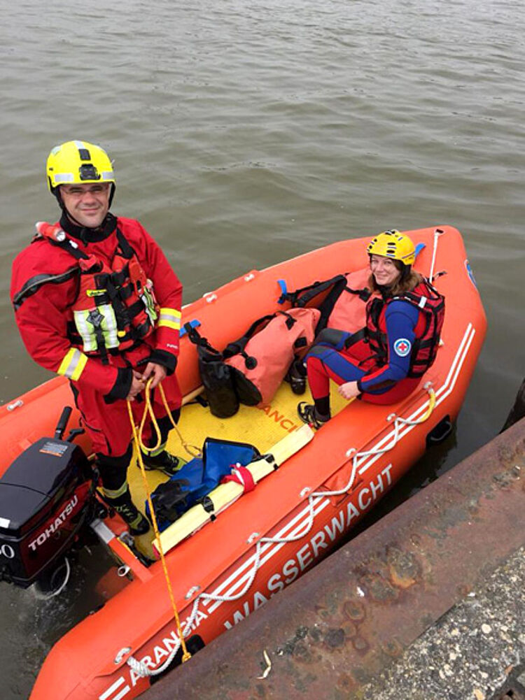 Ganzer Stolz der DRK Wasserwacht ist das Rettungsboot. „Die Zahl der Einsätze zu denen wir wirklich als Schwimmer oder mit dem Boot ins Wasser müssen ist in der Regel überschaubar“, erklärt Johannes Neumann, der Landesleiter der DRK Wasserwacht, „aber es sind gerade diese Einsätze auf die wir als Strandwache optimal vorbereitet sein müssen. Wir führen aus diesem Grund regelmäßig Übungen mit dem Gurtretter und unserem Boot durch, so sind wir für jede Situation gewappnet."