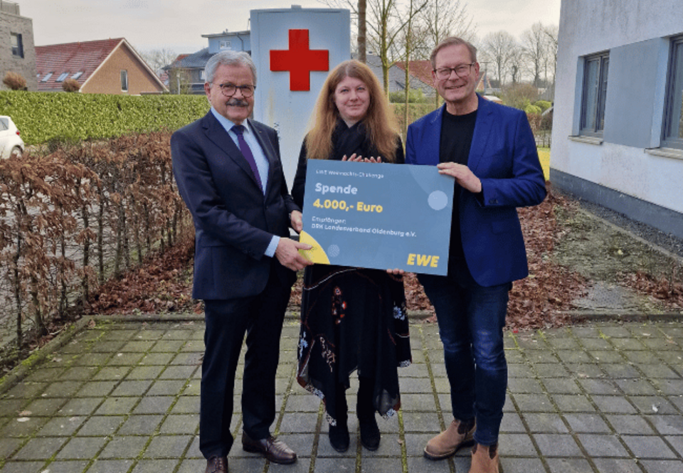 Der DRK-Landesverband Oldenburg e.V. freut sich über eine großzügige Spende in Höhe von 4.000 Euro, die uns vom Energiedienstleister EWE überreicht wurde. Diese Summe stammt aus einer Weihnachts-Challenge des EWE-Vorstands, bei der EWE-Chef Stefan Dohler, Marktvorstand Dr. Christian Friege, Finanzvorstand Dr. Frank Reiners und Vorständin Vera Weidemann gemeinsam mit Mitarbeitenden des Unternehmens kniffligen Fragen und Aufgaben gegenüberstanden. Durch ihr Engagement konnten sie Spendengelder für verschiedene Verbände des Deutschen Roten Kreuzes in den EWE-Heimatregionen zwischen Ems, Weser und Elbe sowie Brandenburg generieren. Dr. Christian Friege übernahm die Patenschaft für unseren Landesverband und erspielte die beeindruckende Summe von 4.000 Euro.