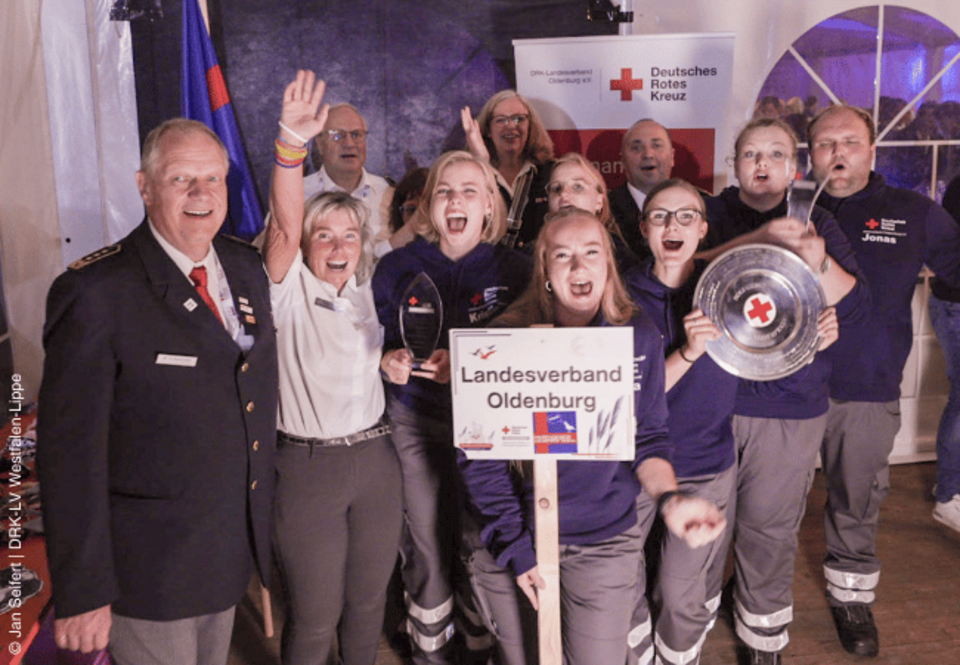 Zum krönenden Abschluss des Tages fand die feierliche Siegerehrung statt. Die Heimmannschaft aus Essen (OIdb.) ging siegreich aus dem Wettbewerb hervor, wurde mit großem Applaus gefeiert und erhielt als Anerkennung ihrer herausragenden Leistungen den Wanderpokal des DRK-Bundeswettbewerbs. Auch die weiteren Platzierten wurden für ihren Einsatz geehrt und mit dem Solferino-Abzeichen für die Teilnahme an einem Bundeswettbewerb ausgezeichnet.