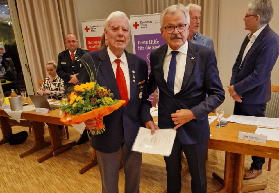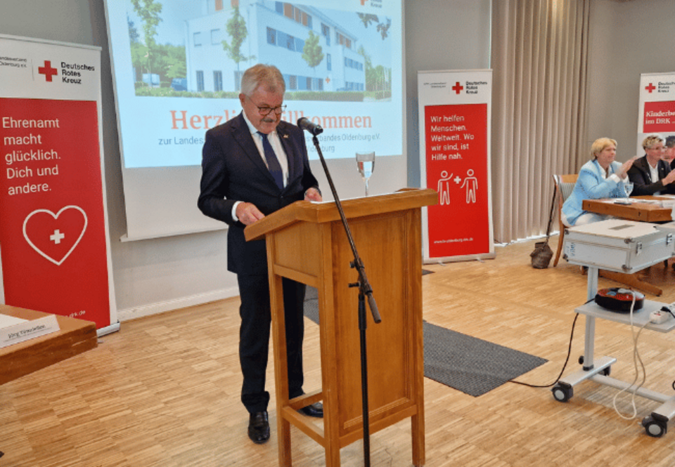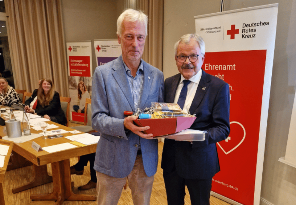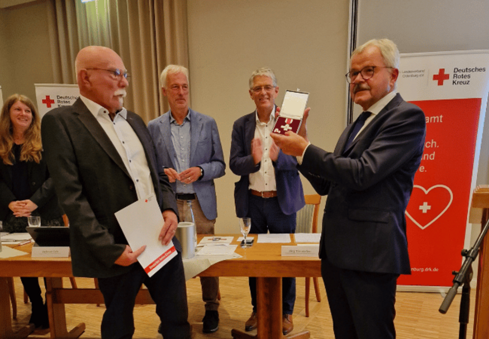 Darüber hinaus wurden mehrere besonders engagierte Rotkreuzlerinnen und Rotkreuzler für ihre herausragenden Leistungen geehrt. Rolf-Günter Buss aus dem DRK-Kreisverband Ammerland e.V. erhielt das Ehrenzeichen des Deutschen Roten Kreuzes. Er wurde geehrt für seinen außerordentlichen Einsatz während der Corona-Pandemie und seine Lebensleistung mit vielfältigen Verdienste für das DRK, insbesondere im Katastrophenschutz und im Fachbereich Information und Kommunikation. Bodo Struthoff aus dem DRK-Kreisverband Oldenburg Land e.V. wurde die Ehrennadel des DRK-Landesverbandes Oldenburg e.V. verliehen. Nach jahrzehntelanger Leitungstätigkeit in den Bereitschaften und dem Ortsverein Hude ist er auch heute mit über 80 Lebensjahren bei der Blutspende und in der Kleiderkammer aktiv. Zudem wurde Peter Wandscher als Vizepräsident verabschiedet und ebenfalls mit der Ehrennadel des DRK-Landesverbandes Oldenburg e.V. ausgezeichnet. Peter Wandscher schied nach 14 Jahren aus dem Präsidium aus, dem er seit 2010 als Justiziar und seit 2018 als Vizepräsident angehörte. Er prägte in dieser Zeit den Landesverband maßgeblich und stellte wichtige Weichen, um den Verband erfolgreich für die Zukunft aufzustellen.