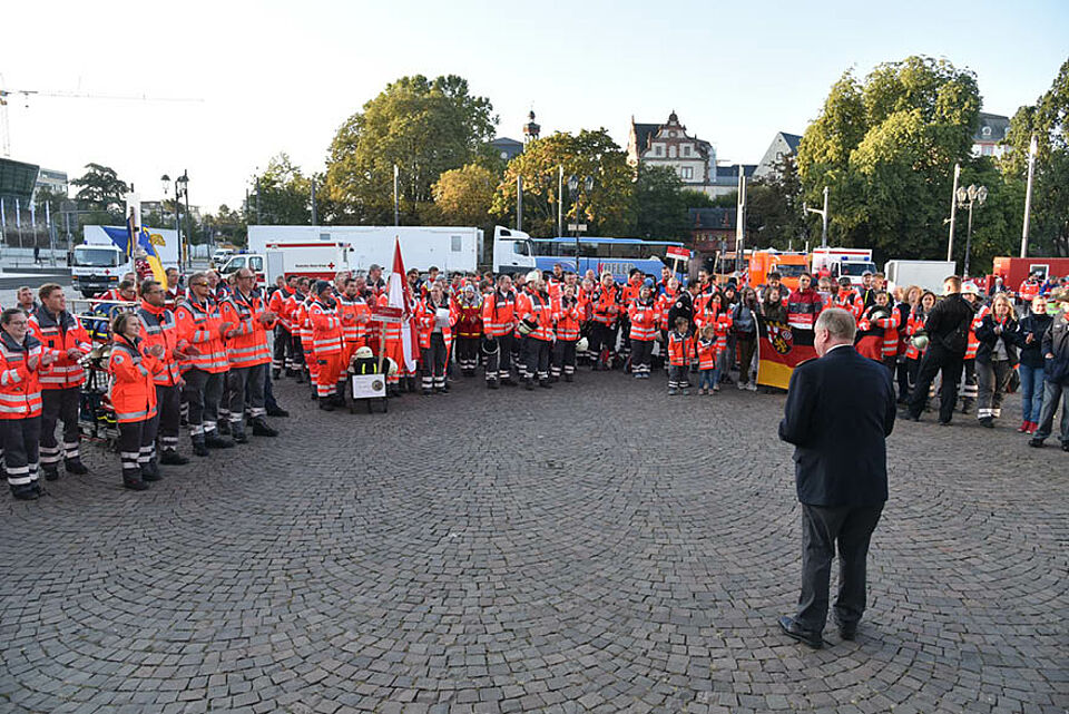 Bei der offiziellen Eröffnung am Samstagvormittag wünschten DRK-Generalsekretär Christian Reuter, der Präsident des DRK Darmstadt-Stadt Dr. Gregor Wehner, Hessens Innenminister Peter Beuth, der Oberbürgermeister von Darmstadt Jochen Partsch, der Präsident des DRK-Landesverbandes Hessen Norbert Södler und DRK-Bundesarzt Prof. Dr. Peter Sefrin allen beteiligten Teams viel Erfolg und bedankten sich beim DRK-Ortsverein Arheilgen, dem DRK-Darmstadt, bei der DRK-Landesverstärkung Fritzlar und beim DRK-Landesverband Hessen für die Bewältigung der umfangreichen Organisationsaufgaben im Vorfeld. Alle waren sich einig, dass der Bundeswettbewerb in der Darmstädter Innenstadt eine „Visitenkarte des DRK sei und für das Ehrenamt werbe“. Die Bevölkerung könne in „echten“ Unfallsituationen sehen, wie wichtig Ersthelferkenntnisse seien.