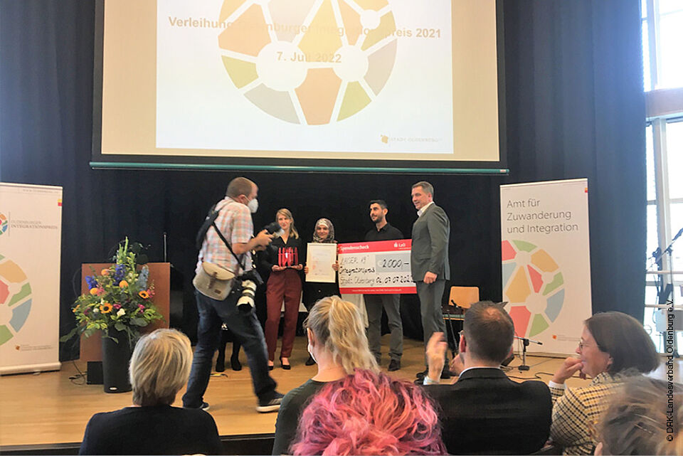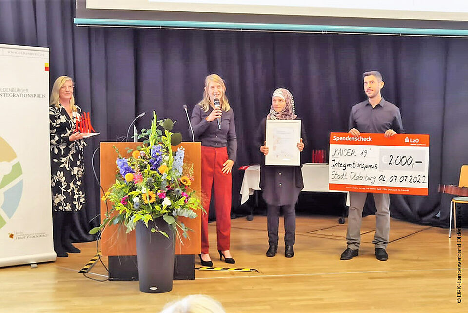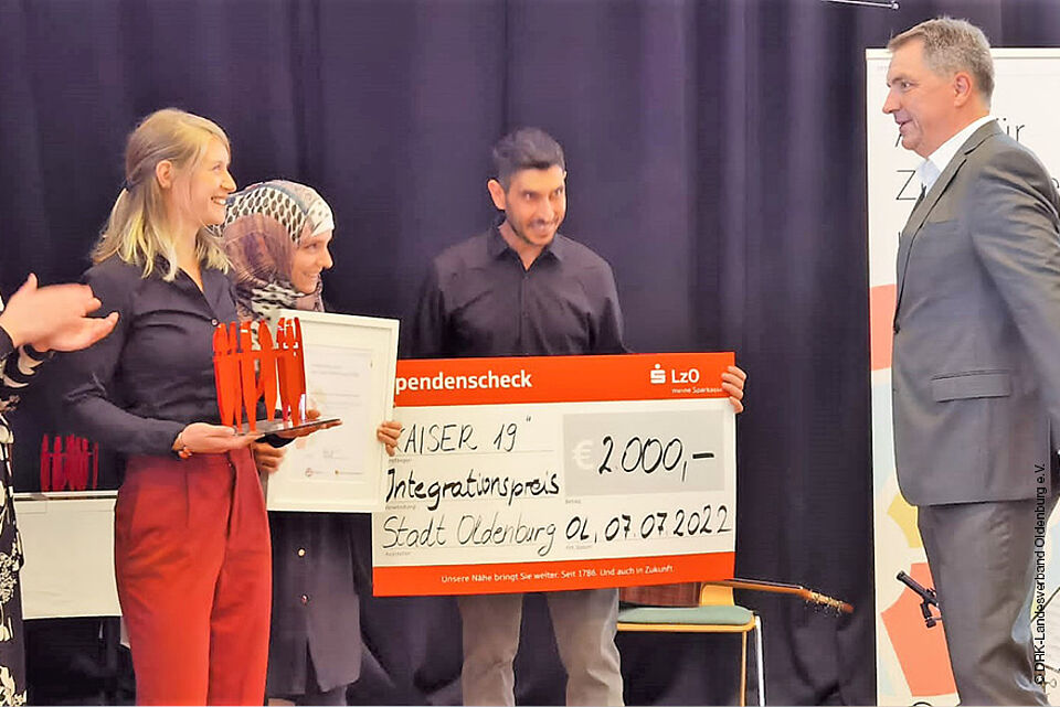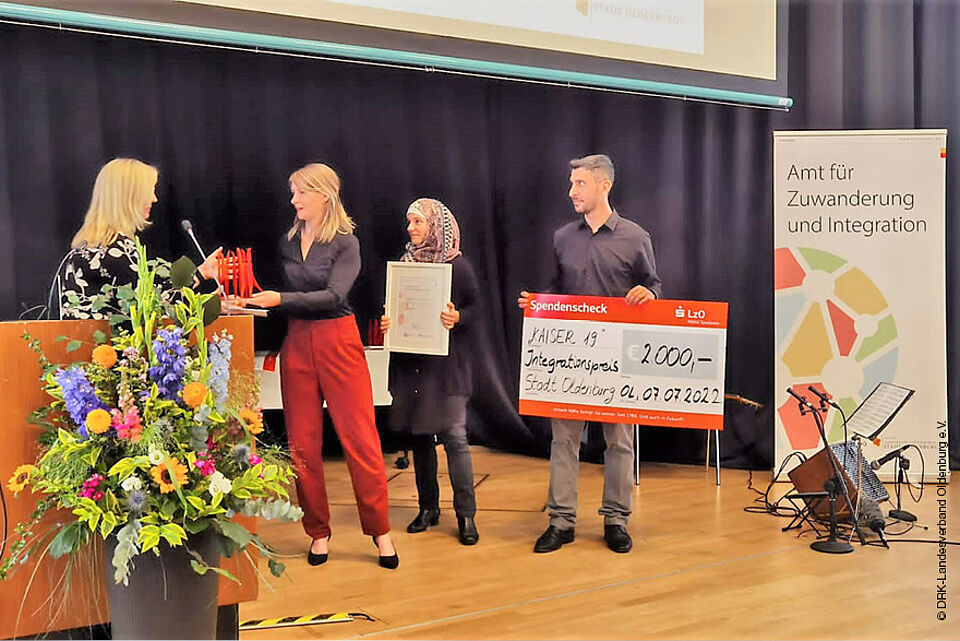Der 12. Integrationspreis der Stadt Oldenburg wurde an das Begegnungszentrum des DRK-Landesverbandes Oldenburg e.V. verliehen. Seit der Eröffnung im Jahr 2018 hat sich das KAISER 19 zum zentralen Raum für eine Vielzahl an Aktivitäten in den Bereichen Freizeit, Empowerment, Bildung und Unterstützung beim Arbeitsmarktzugang sowie Begegnung und Austausch zwischen Ehrenamtlichen und Zugewanderten in Oldenburg entwickelt.