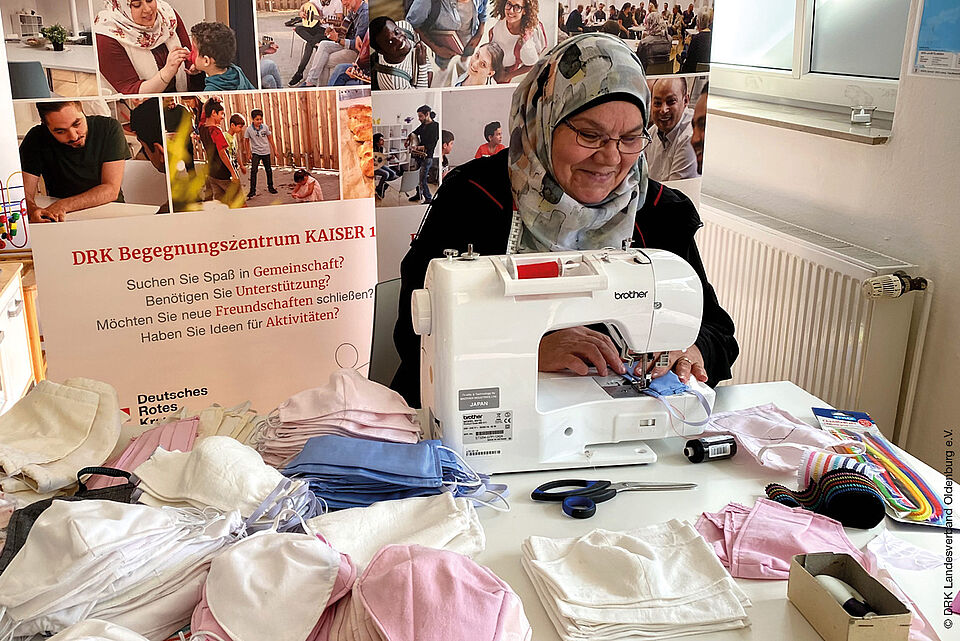 Die Idee zu der Masken-Schneiderei hatte Maria Rissel, eine langjährige ehrenamtliche Mitarbeiterin des DRK Begegnungszentrum KAISER 19. Als das Haus Mitte März seine Türen für die 50 Ehrenamtlichen und den Publikumsverkehr schließen musste, versorgte sie in den darauffolgenden Tagen alle hauptamtlich Mitarbeitenden im KAISER 19 und deren Familien mit einer selbst genähten Alltagsmaske. „Für die erste habe ich eine ganze Stunde gebraucht, für die zweite dann nur noch 15 Minuten“, erzählt Maria Rissel ein wenig stolz. Inzwischen wirken insgesamt acht gelernte Schneiderinnen und Schneider und begeisterte Hobby-Näherinnen und Näher von zu Hause aus am Projekt mit. Die meist zugewanderten Schneiderinnen und Schneider hatten sich in den Nähkursen des Begegnungszentrums kennengelernt und jetzt ihre Hilfe angeboten.
