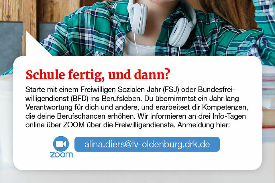Do, 09.07.2020, 17:00 Uhreine gute Gelegenheit, sich umfassend zu informieren. Die pädagogischen Mitarbeiterinnnen des DRK Landesverband e.V. stellen Inhalte, Vorteile und die vielfältigen Möglichkeiten von FSJ und BFD in einem digitalen Online-Seminar über die Konferenzplattform „Zoom“ vor. Interessierte melden sich dazu per E-Mail bei alina.diers(at)lv-oldenburg.drk(dot)de für einen der drei Termine an und erhalten einen Zugangs-Link für die gewünschte Veranstaltung sowie eine kurze Anleitung zur Nutzung der Plattform.