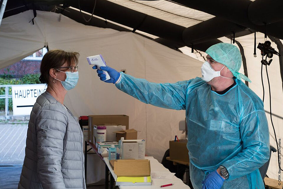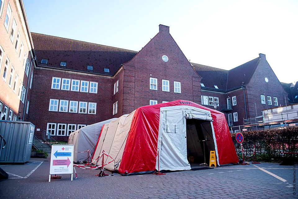 Der DRK Kreisverband Jeverland e.V. betreibt in Zusammenarbeit mit der Friesland Kliniken gGmbH seit Anfang April ein Screeningzelt vor dem Krankenhaus Sanderbusch. Neben der Abfrage des Gesundheitszustands mittels eines standardisierten Fragebogens, findet eine Fiebermessung statt. Auf diese Weise werden Patienten und Personal des Krankenhauses vor dem Corona-Virus geschützt. In den zwei Druckluftzelten sind Rotkreuzlerinnen und Rotkreuzler aus den DRK Bereitschaften Schortens, Sande und Jever im Einsatz. Vor dem Krankenhaus in Varel betreibt der DRK Kreisverband Varel-Friesische Wehde e.V. ebenfalls weiterhin ein Screeningzelt (wir berichteten).