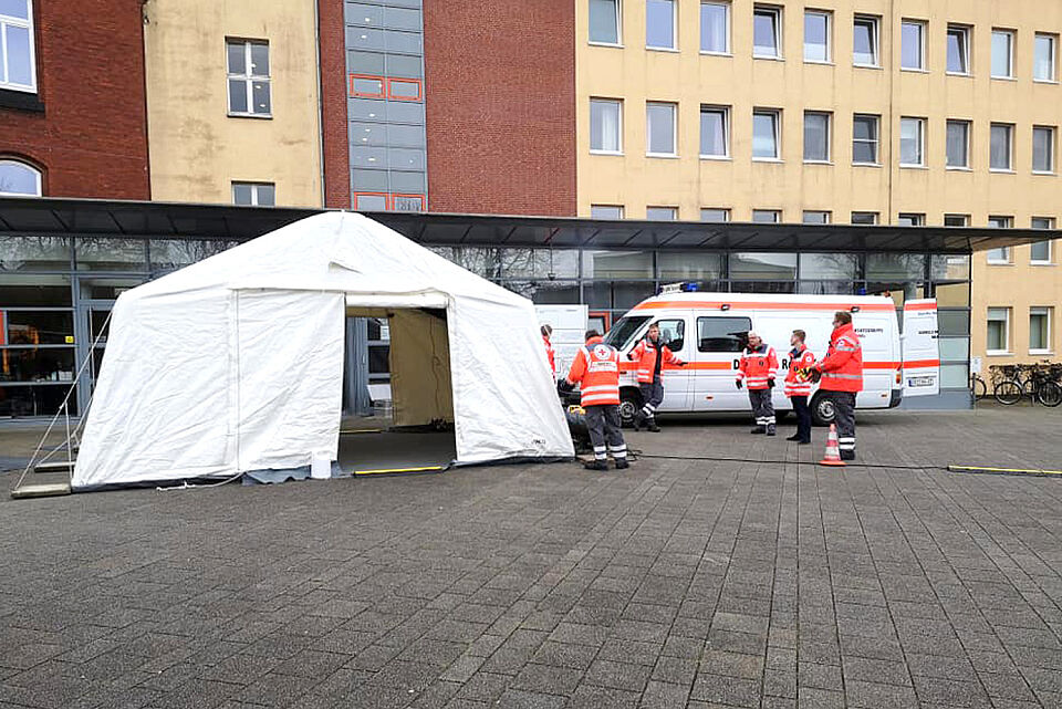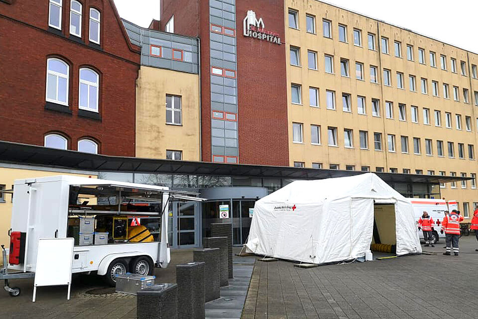 Vor dem St.-Johannes-Hospital haben die DRK Bereitschaften Varel und Friesische Wehde zwei pneumatische Zelte aufgebaut. Hier sind jetzt jeden Tag 4 Ehrenamtliche von morgens um 7 Uhr bis abends um 20 Uhr in wechselnden Schichten im Einsatz. Die Rotkreuzlerinnen und Rotkreuzler führen bei allen Besuchern eine Fiebermessung durch. Sie helfen so Patienten und Personal des Krankenhauses vor einer Ansteckung mit dem Corona-Virus zu schützen. Auch Ilka Menzler, die Geschäftsführerin des DRK Kreisverbandes Varel-Friesische Wehde e.V. hat bereits in der Screening-Station ausgeholfen. Weitere Informationen gibt der Bericht der NWZ.