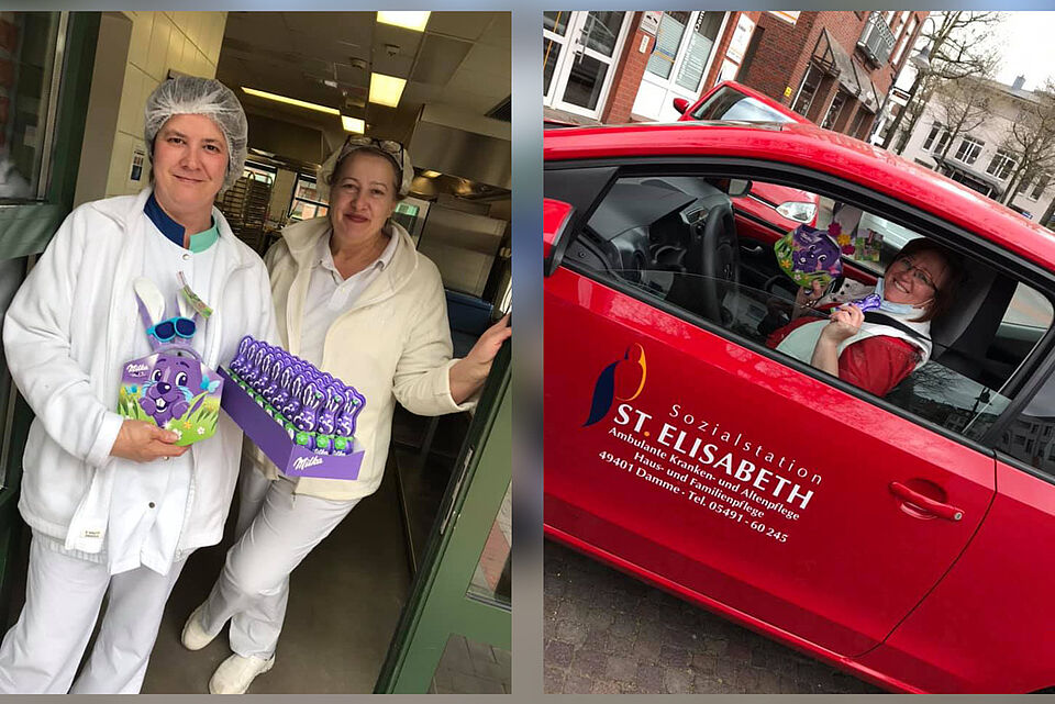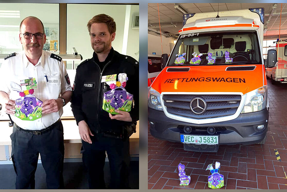 Die Bereitschaft des DRK Kreisverbandes Vechta e.V. ist außerdem auf Schoko-Tour gegangen und hat den Mitarbeitenden der Krankenhäuser, der Rettungsleitstelle, der Rettungswachen und der Polizeidienststellen eine kleine Freude gemacht. Außerdem haben die Apotheken im Notdienst, Pflegeheime und geöffnete Bäcker und Tankstellen einen schokoladigen Ostergruß erhalten.