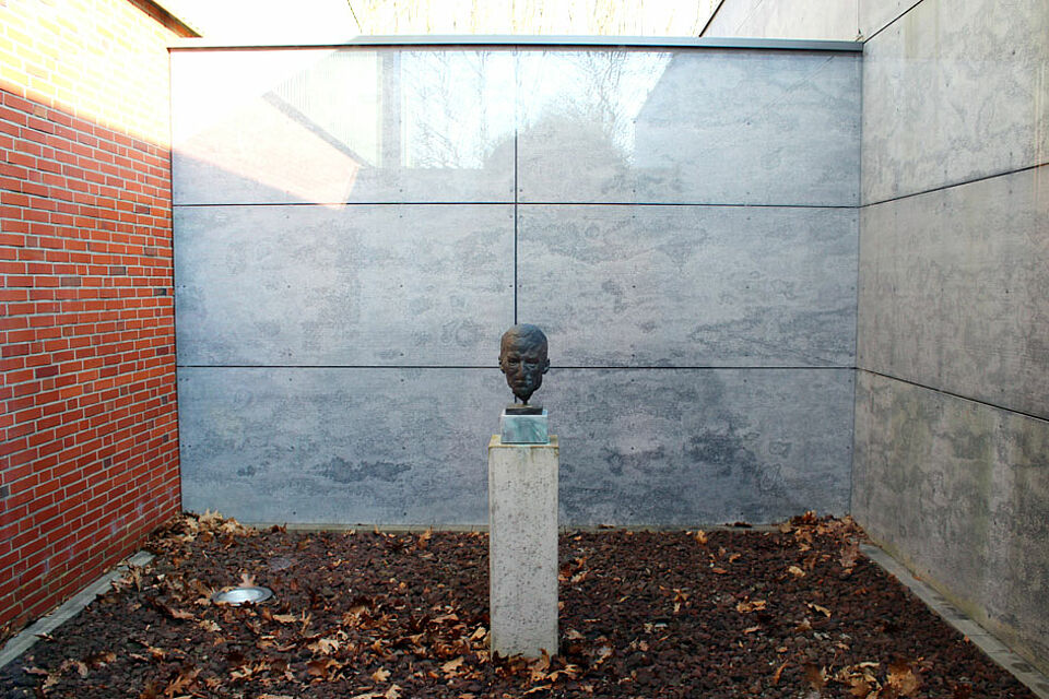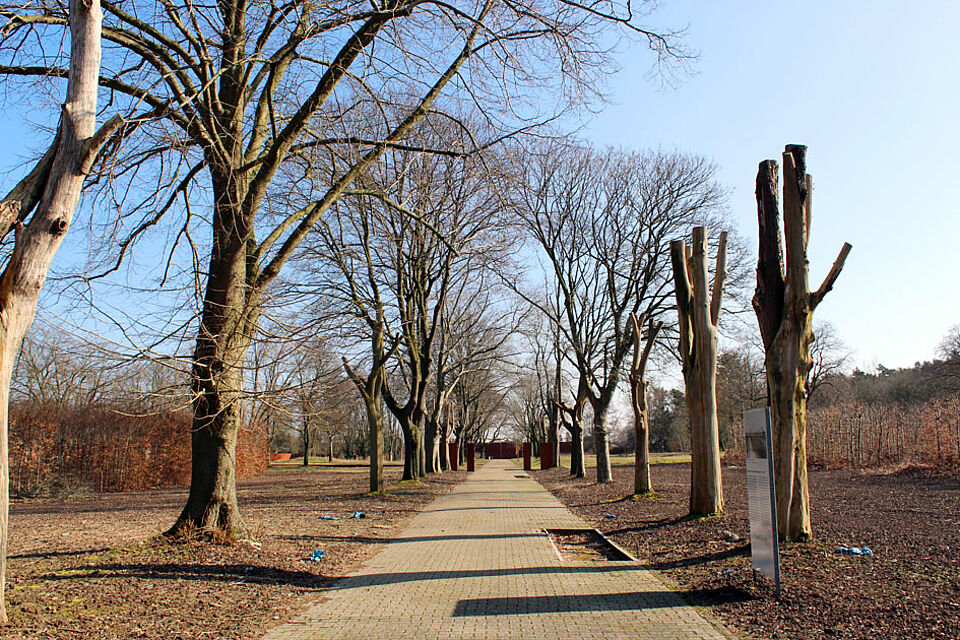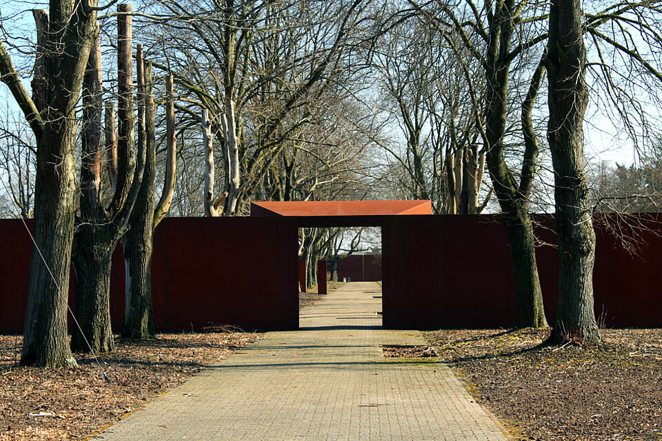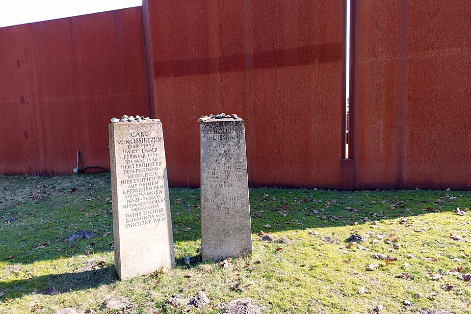 Links eine Gedenkinschrift für den Insassen Carl von Ossietzky. Die rostige Wand soll das ehemalige Lagertor, der schmale Spalt die nicht erreichbare Freiheit symbolisieren.